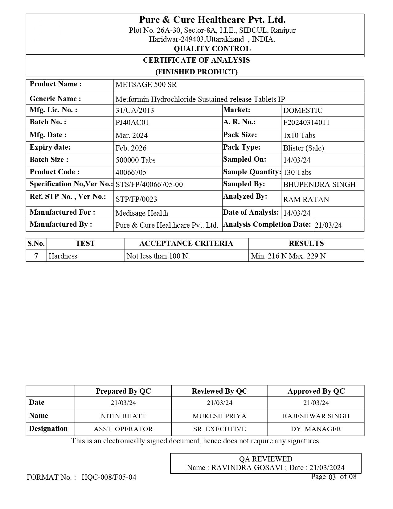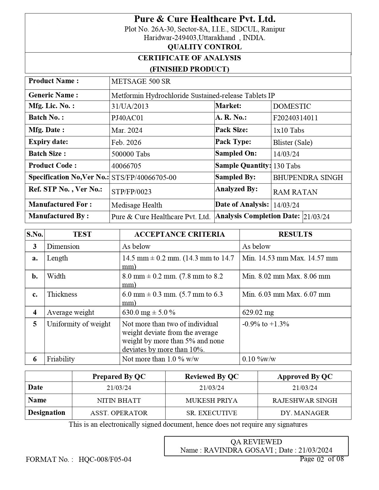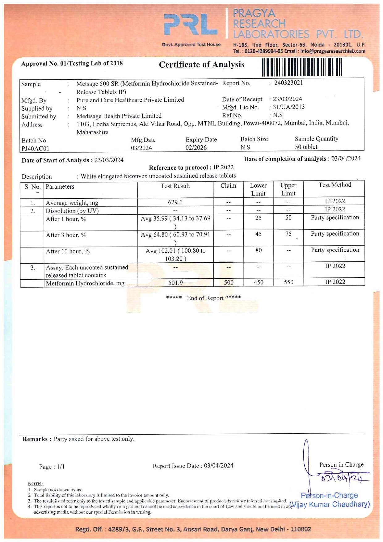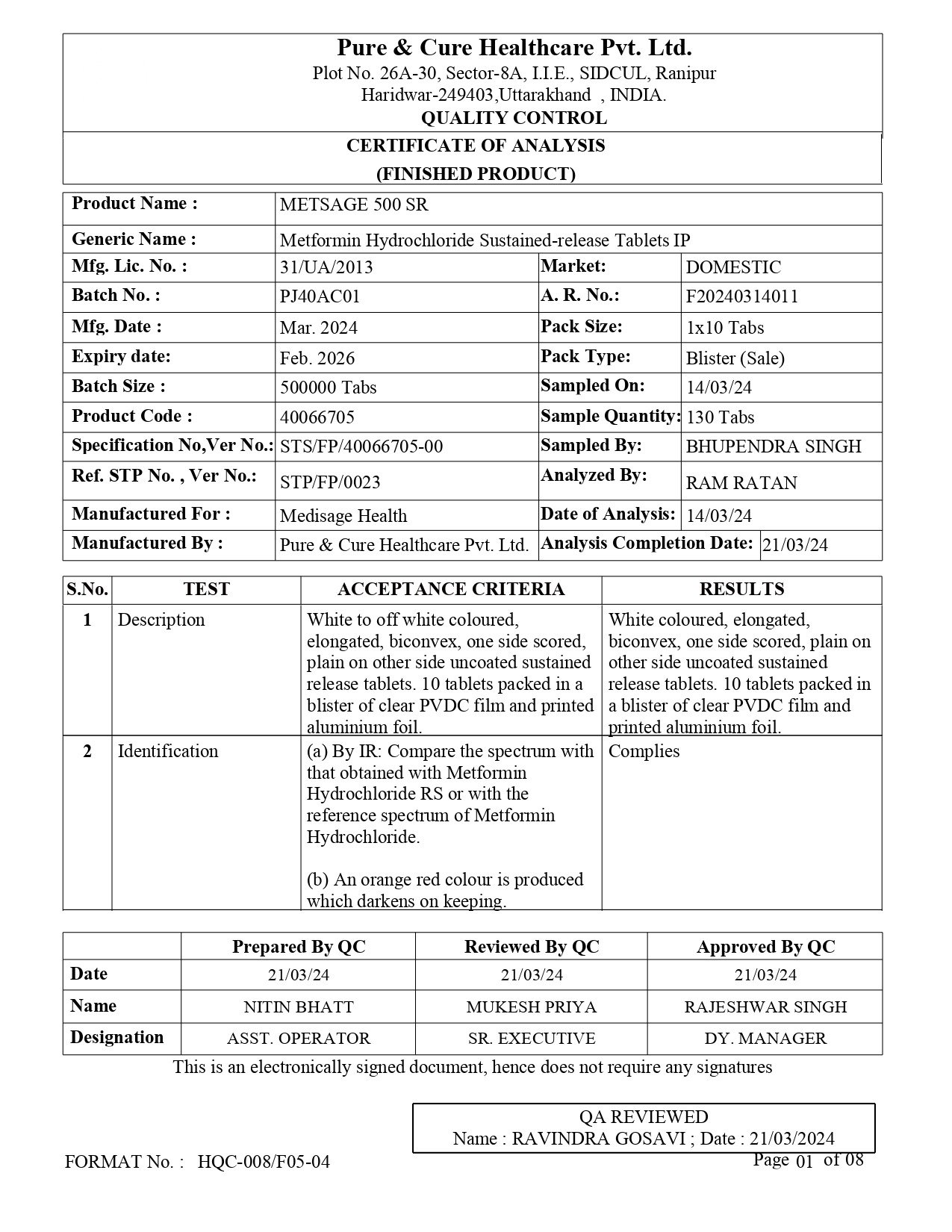 Each uncoated sustained release tablet contains: metformin hydrochloride IP 500mg