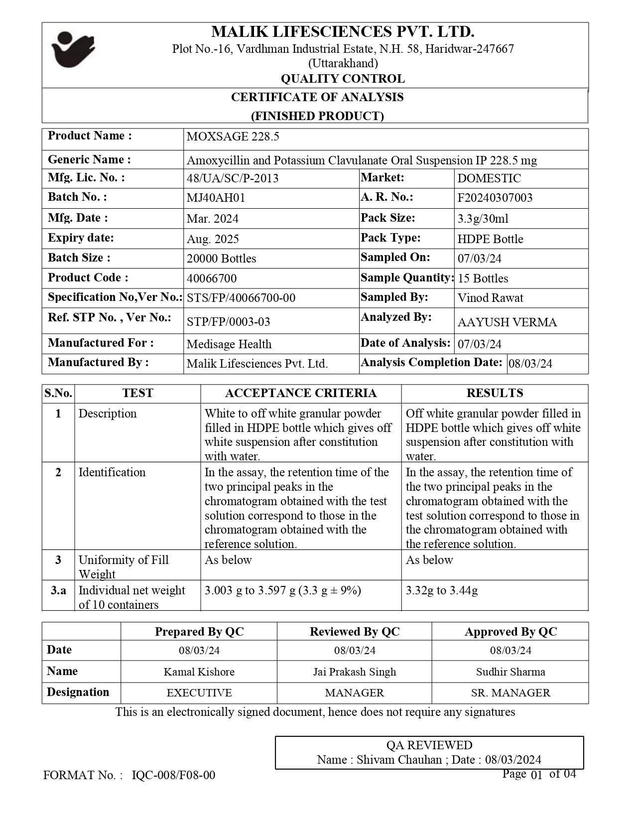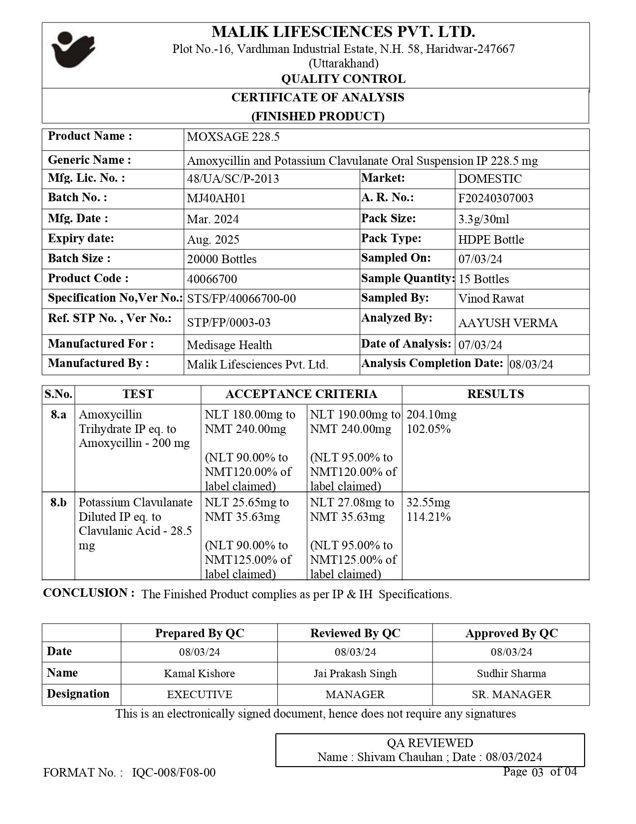(A) Amoxycillin and potassium clavulnate oral suspension IP